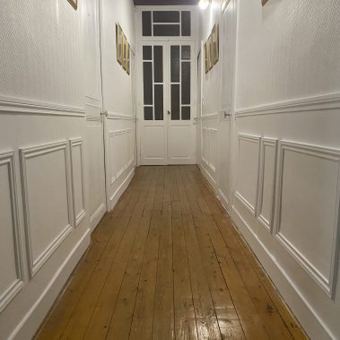 - Peinture intérieure et traitement du bois : murs, plafonds, boiseries (portes/fenêtres/plinthes/poutres…), mobilier, parquets…