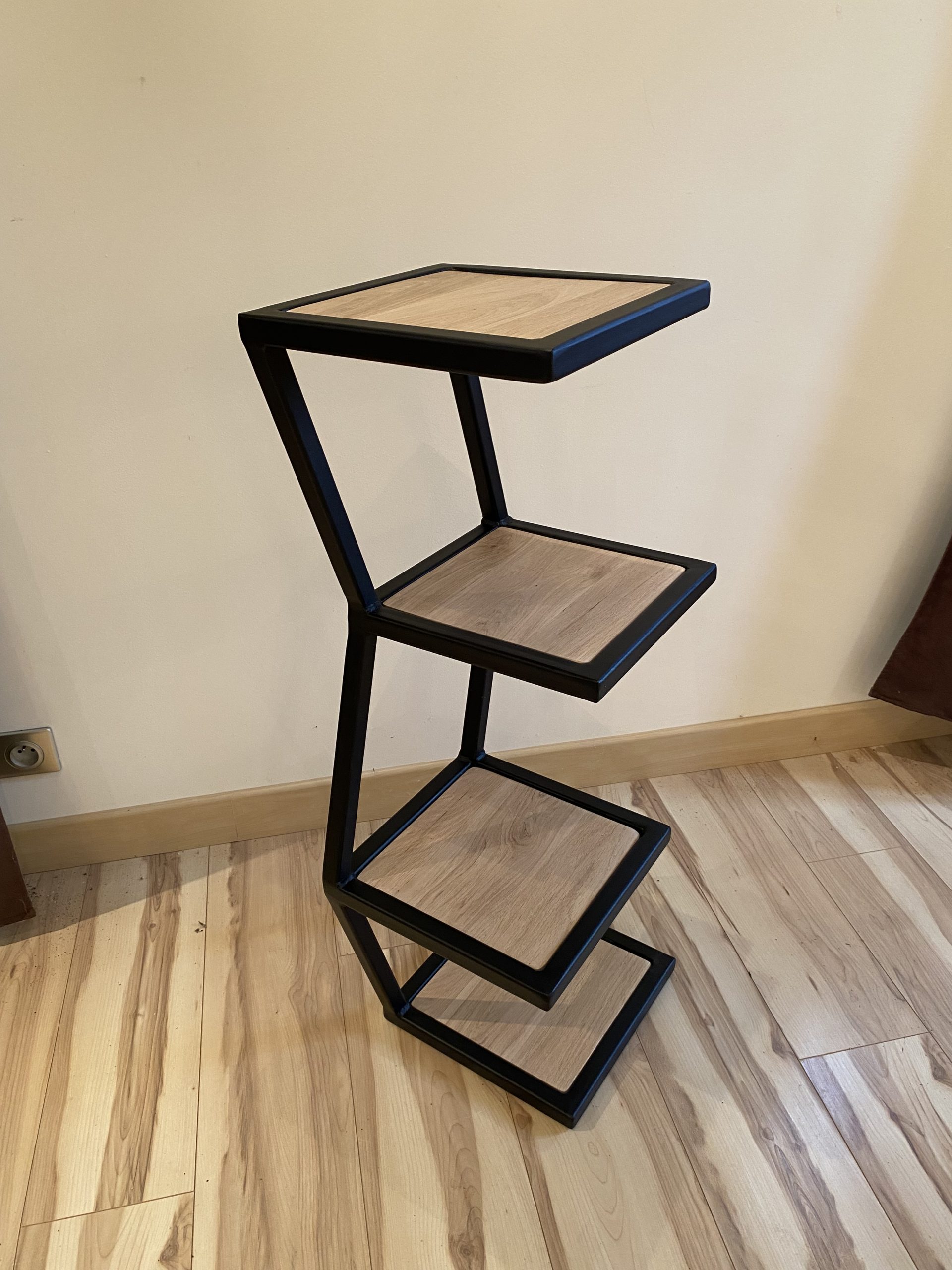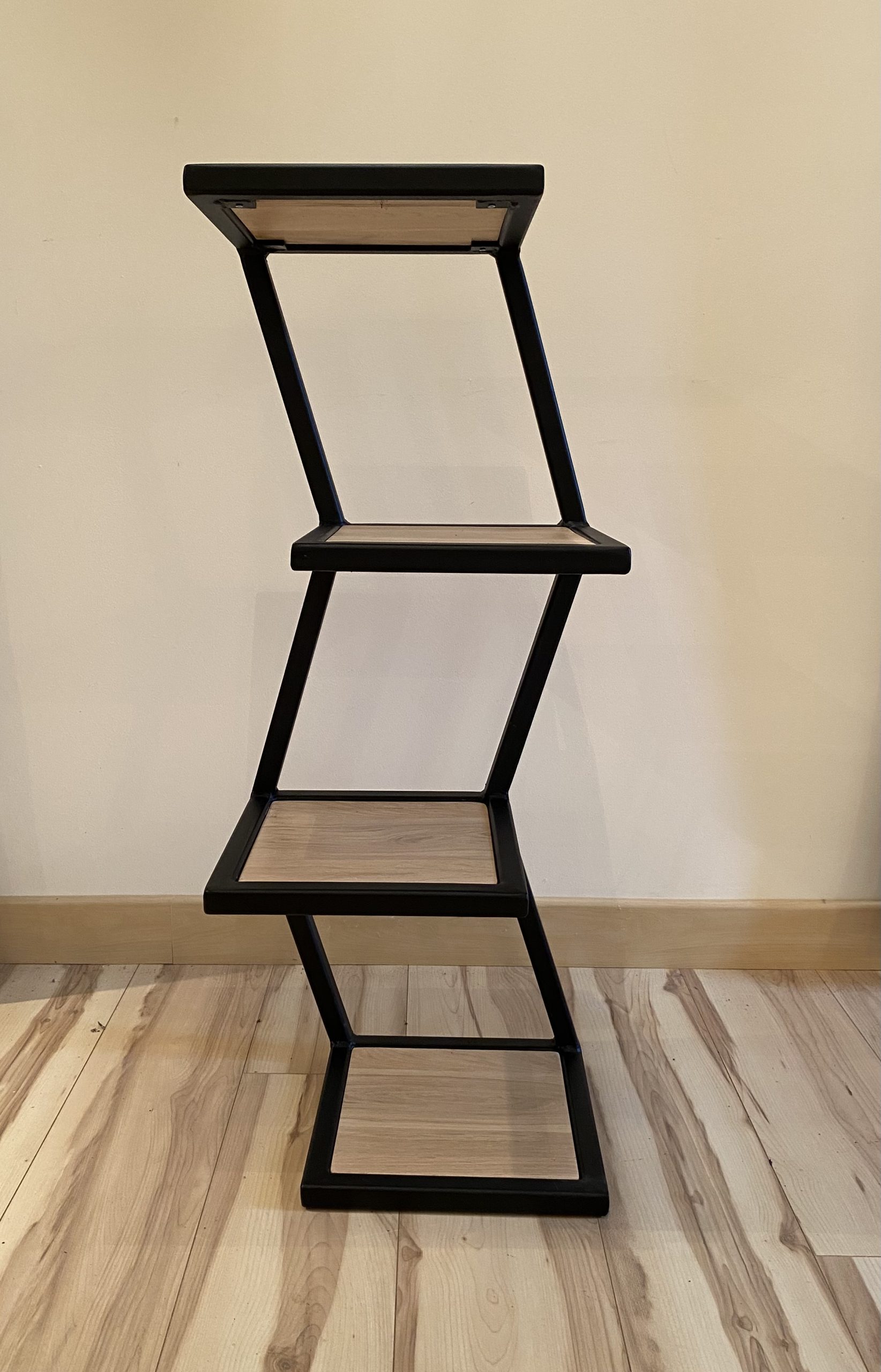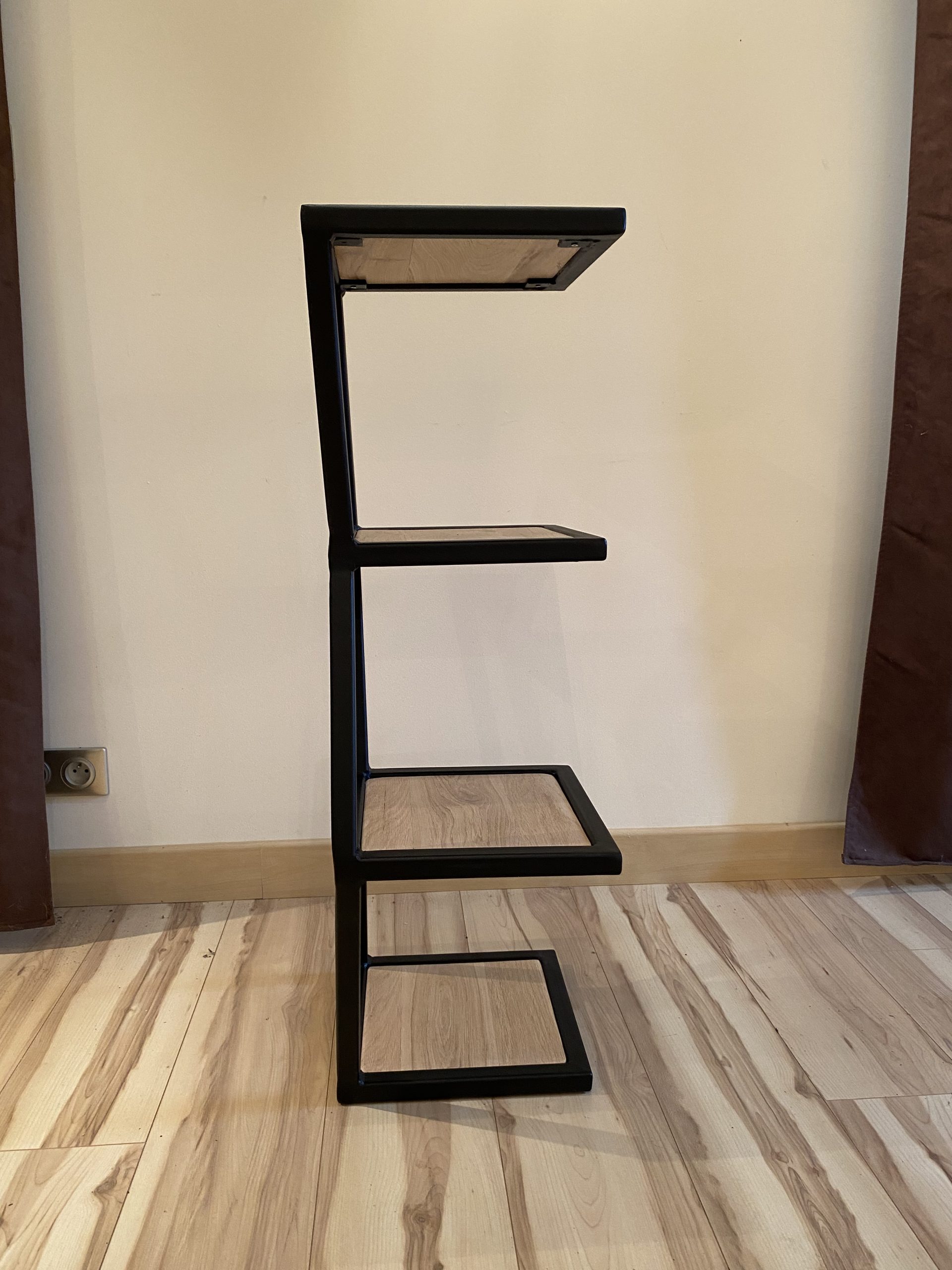 Avec sa structure en acier noir et ses plateaux en bois massif, cette étagère zig zag joue sur les lignes, les angles et les contrastes. Son allure aérienne attire immédiatement le regard tout en restant élégante et épurée.